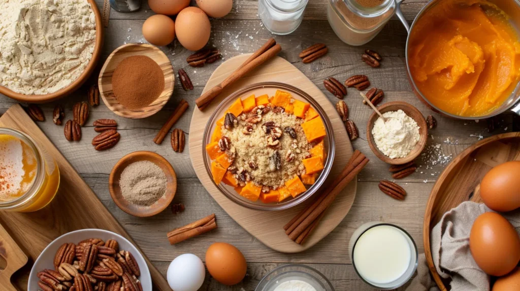 - Make the Pecan Topping: In a separate bowl, combine flour, brown sugar, granulated sugar, melted butter, and chopped pecans. Stir until the texture resembles coarse crumbs.